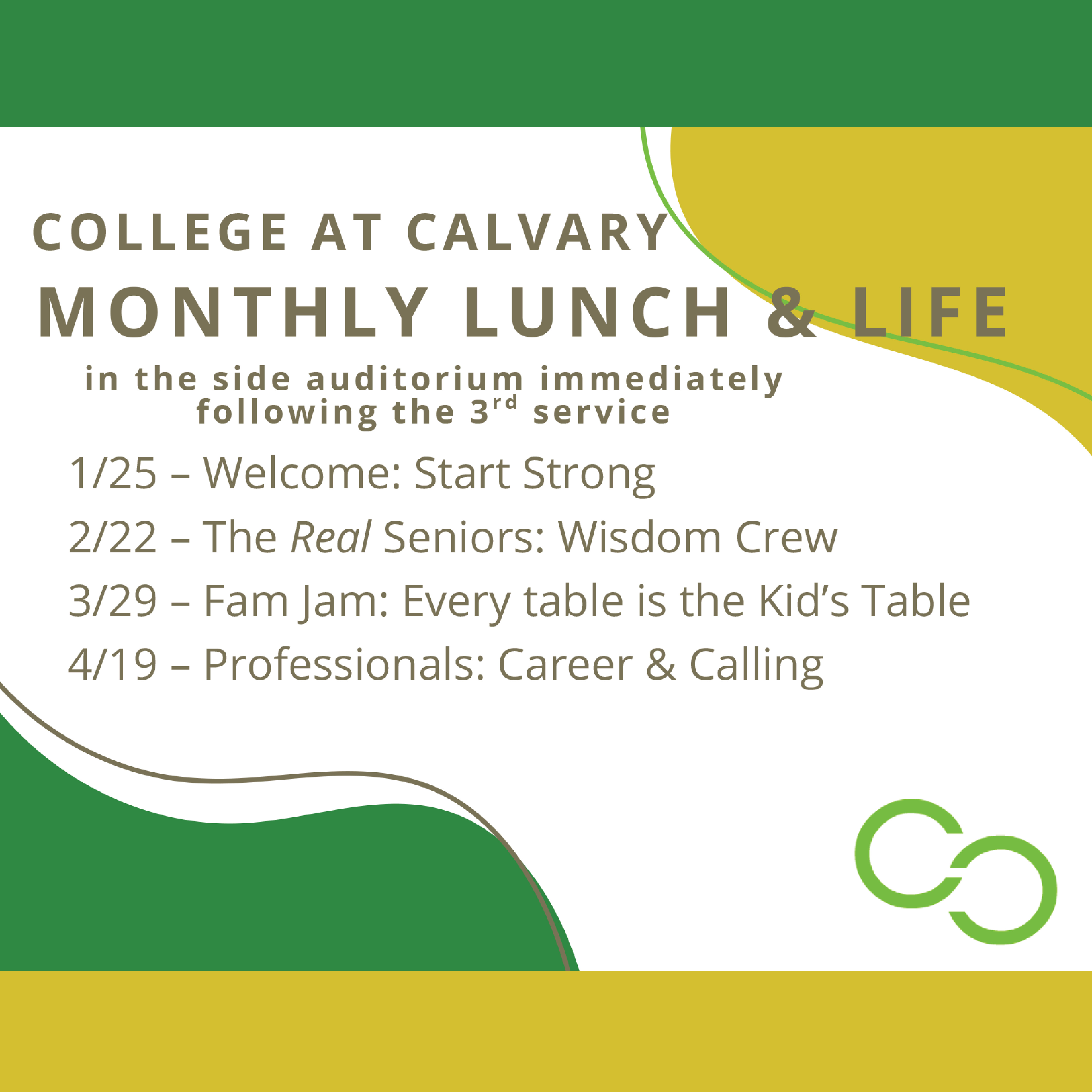 Once a month we will have a lunch in the side auditorium starting around 12:20 pm. You don’t need to sign up - just come... and bring your friends!